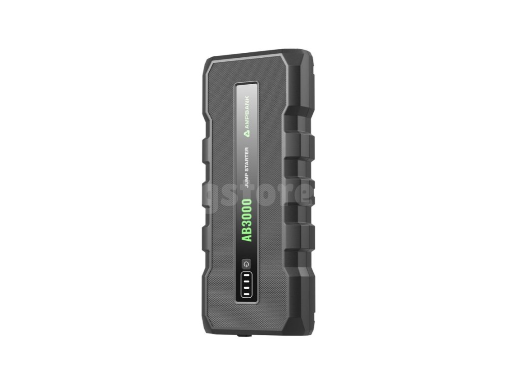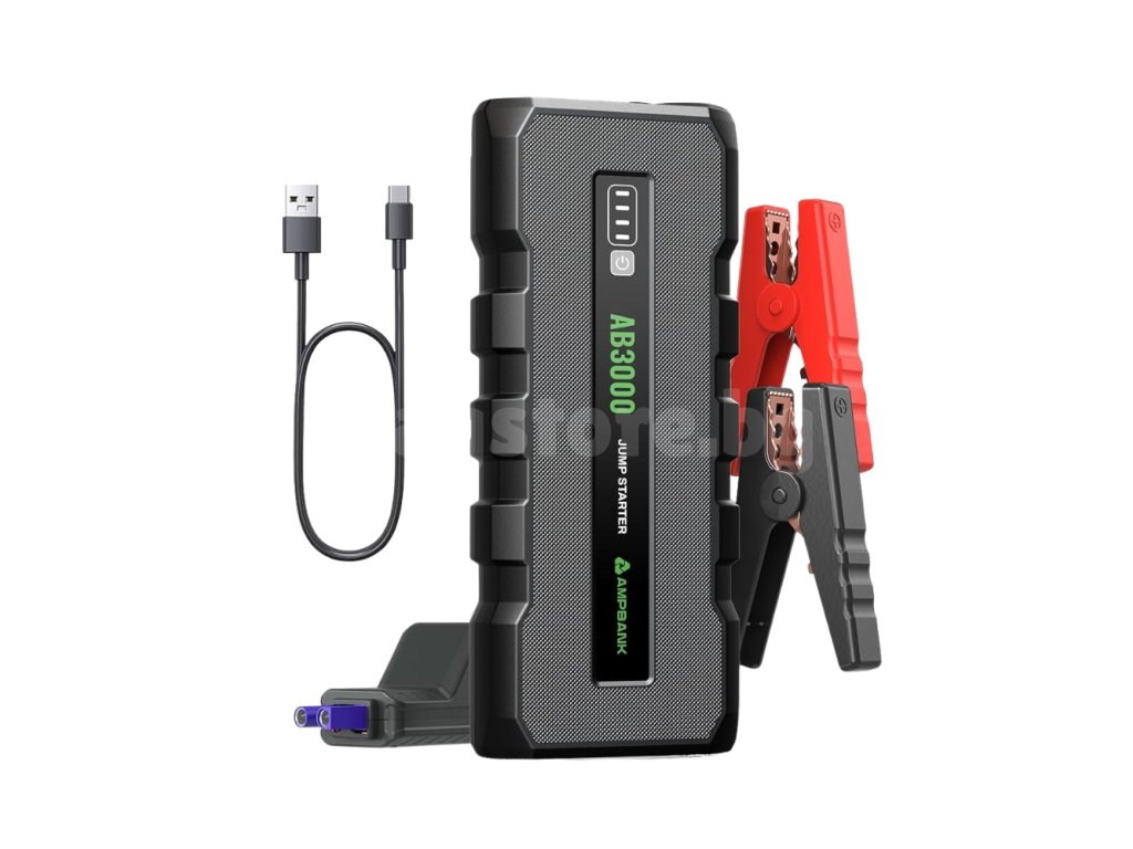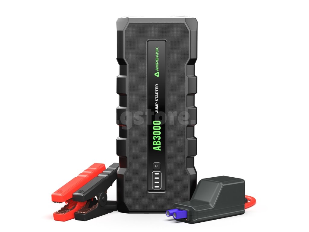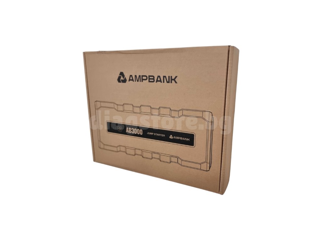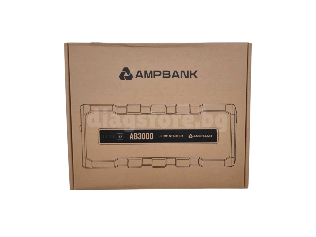 - Мощен стартер за акумулатор – стартова батерия (jump starter) AMPBANK AB3000 има пиков ток 3000 A и може да стартира за секунди почти всички 12V двигатели на автомобили (с обем до 8l (бензин) или 6l (дизел)). Напълно съвместим с 12V автомобили, камиони, SUV, мотоциклети, трактори, косачки и др.