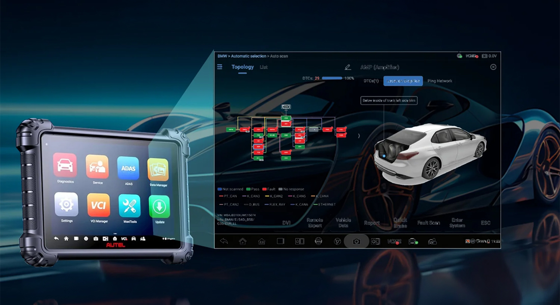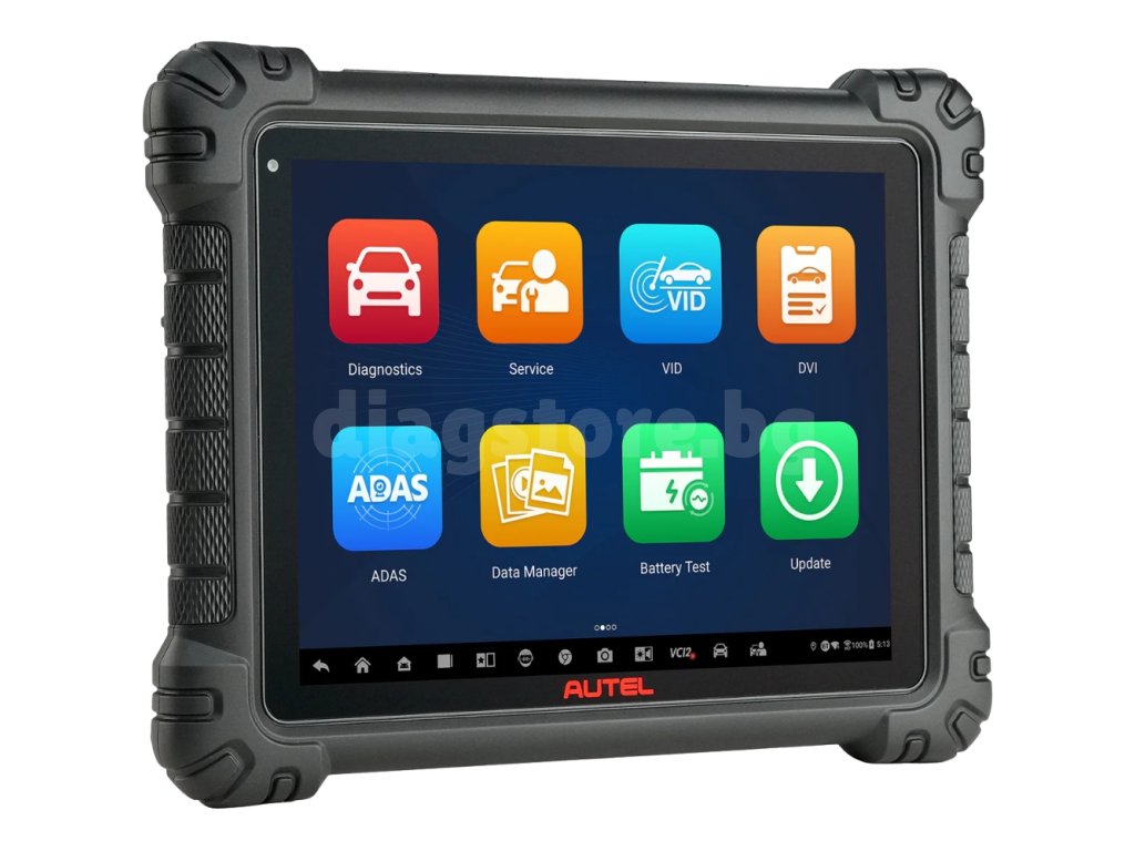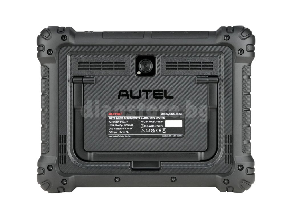 Autel MaxiSys MS909S2 е сред най-модерните диагностични системи от серията MaxiSys и е предназначен за професионални сервизни центрове, които работят с модерни автомобили и сложни комуникационни протоколи. Той предлага пълна диагностика на всички управляващи единици, усъвършенстван анализ на данни, топологично изображение на ECU (Topology 3.0) и поддръжка на онлайн кодиране и ECU програмиране. Основата на системата е мощен таблет с операционна система Android 13, осемядрен процесор, 12 GB RAM и 256 GB вътрешна памет, който осигурява бърза реакция дори при работа с обширни данни на живо. Част от него е интерфейсът MaxiFlash VCI2, който поддържа комуникация чрез USB, Wi-Fi и Bluetooth и отговаря на стандартите SAE J2534, ISO 22900 и RP1210 за PassThru програмиране. Важно предимство е AI гласовият асистент, който позволява hands-free управление на диагностиката (стартиране на автоскен, отваряне на сервизни функции, активни тестове и др.). MS909S2 също така поддържа разширена цифрова инспекция на автомобила (DVI), включително работа с фотографии, измерване на гуми и създаване на сервизни доклади.