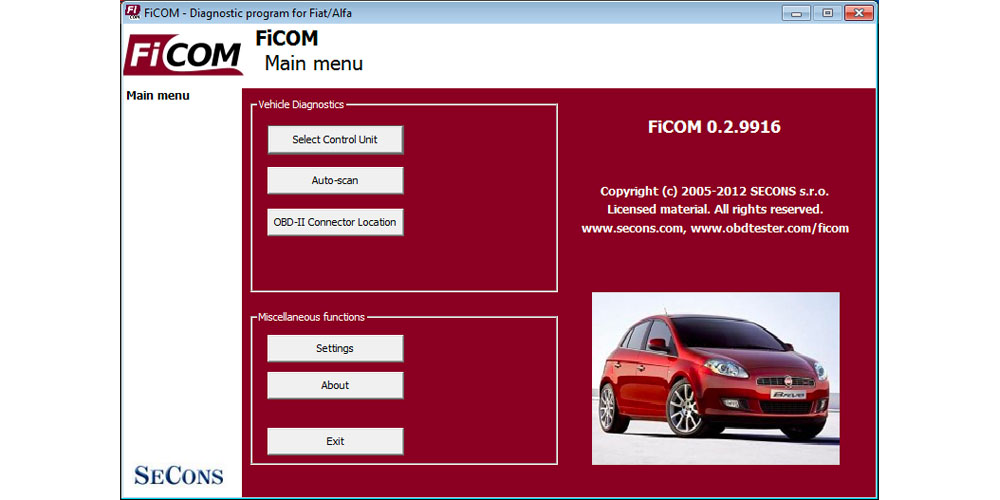 FiCOM е диагностика на съвместими с Fiat автомобили, т.е. Fiat, Alfa Romeo, Lancia и Iveco. Комплектът се състои от интелигентен диагностичен адаптер с USB връзка и програма за Windows OS. Предимството е произходът на европейския производител Secons и неограничените актуализации, включени в цената. Техническата поддръжка от производителя е предимство - ако откриете неподдържан контролер или някоя функция не работи както се очаква, е възможно да се свържете с нас или директно с производителя.