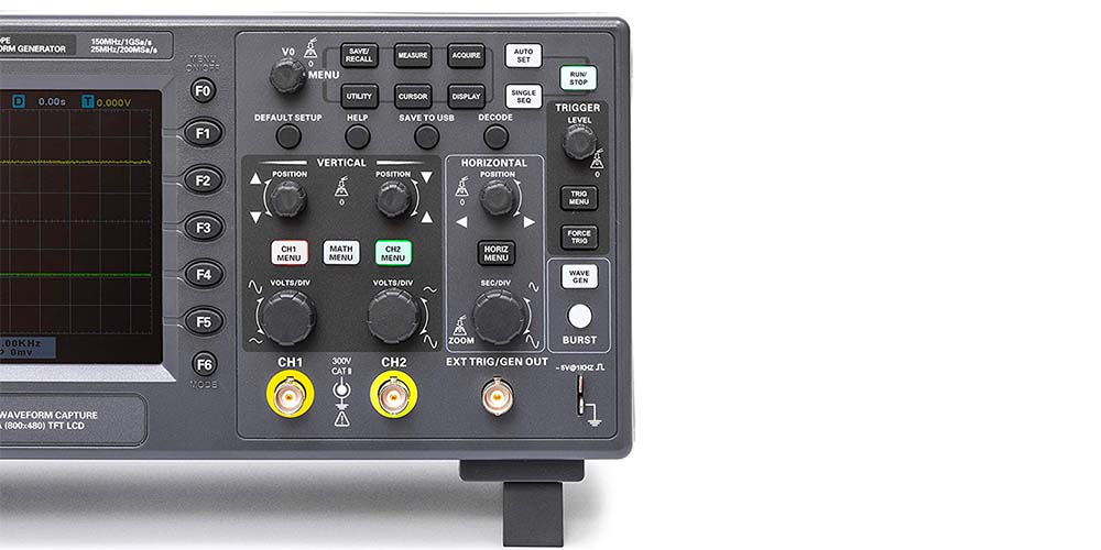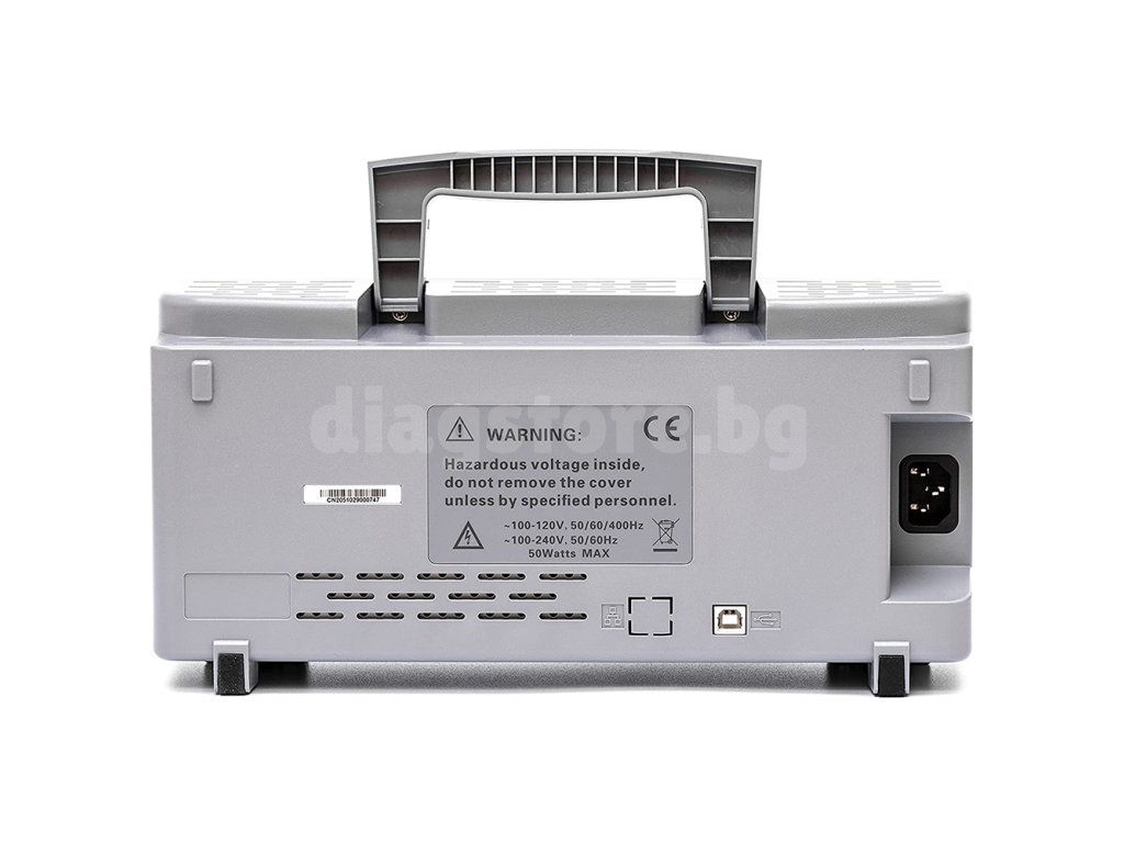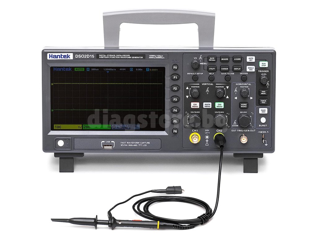 Hantek DSO2D15 е основен **двуканален осцилоскоп**, но може да изненада с функциите си и със сигурност ще зарадва както любителите, така и напредналите потребители. С честотна лента от 150MHz и **вграден генератор на функции**, той също така разполага с **I2C, SPI, UART/RS232 и CAN декодиращи и задействащи възможности**. DSO2D15 има **честота на дискретизация до 1GSa/s и дълбочина на паметта е 8Mpts**, освен това има възможност да **измерва променлив и постоянен ток до 300 VRMS. Осцилоскопът е **пасивно охлаждан**, без вентилатор, така че е **напълно безшумен**. Има и **USB интерфейс за запазване на резултатите от измерванията** на компютър или карта с памет.