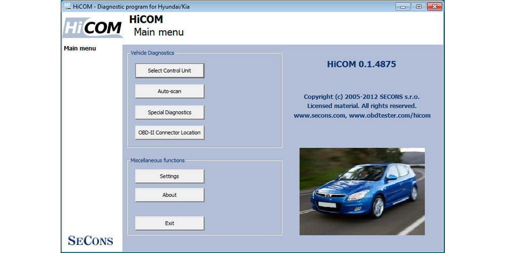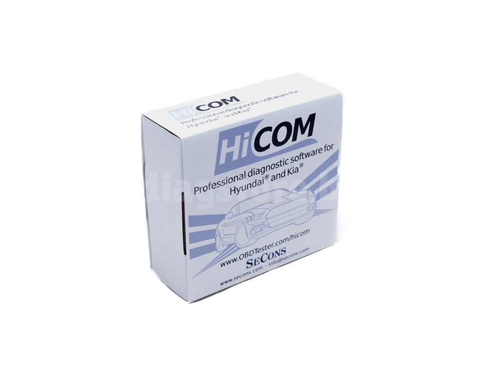 HiCOM е диагностичният продукт за автомобили Hyundai и някои Kia. Комплектът се състои от интелигентен диагностичен адаптер с USB връзка и програма за Windows OS. Предимството е произходът на европейския производител Secons и неограничените актуализации, включени в цената. Техническата поддръжка от производителя е предимство - ако откриете неподдържан контролер или някоя функция не работи както се очаква, е възможно да се свържете с нас или директно с производителя.