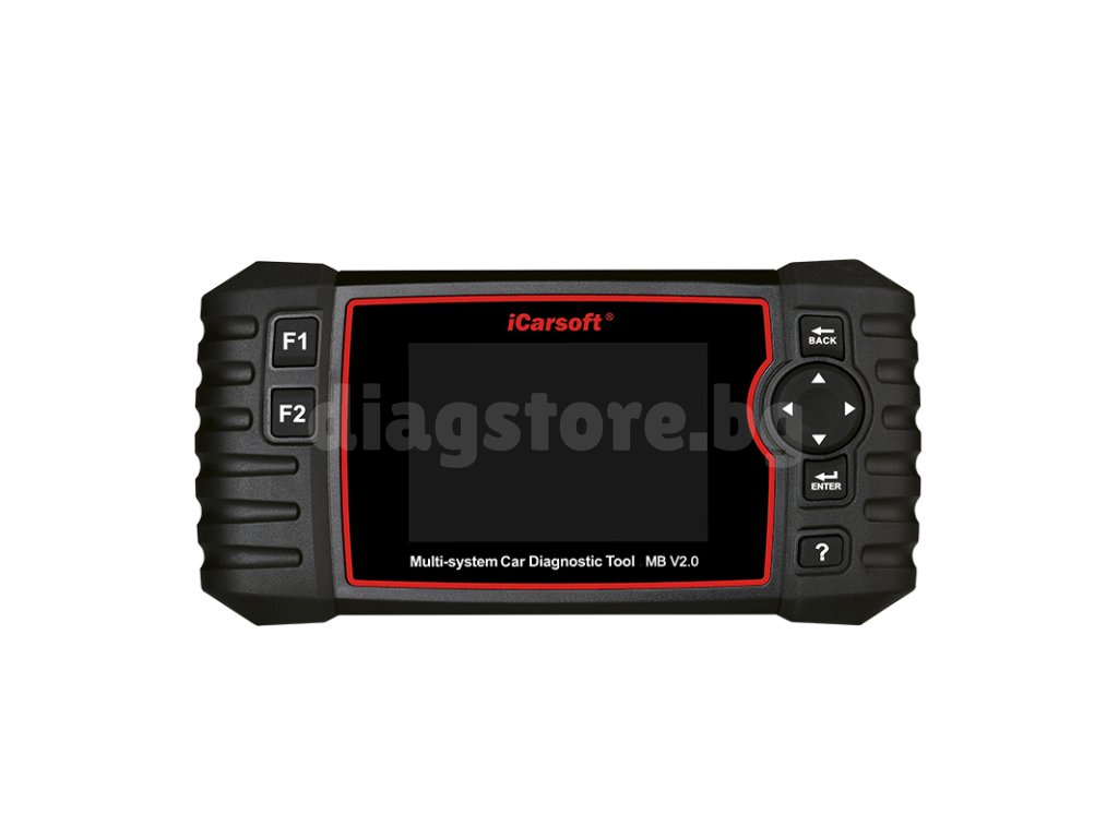 iCarsoft MB V2.0 е диагностичен инструмент, позволяващ свързване към всички управляващи блокове на автомобили Mercedes и Maybach. Устройството е оборудвано с 4" цветен екран и е готово за употреба. Актуализациите на софтуера на устройството са напълно безплатни и се извършват чрез компютър (включен е USB кабел). Устройството разполага с широка гама от поддържани езици. Поддържат се автомобили от 1996 до 2016 г. Скенерът iCarsoft позволява подробна диагностика на всички агрегати и предлага 6 сервизни функции, като например нулиране на сервизните интервали, регенерация на DPF филтъра, диагностика и освобождаване на електрическата ръчна спирачка, регистрация на батерията и много други. Устройството е свързано към автомобила чрез OBD-II кабел.