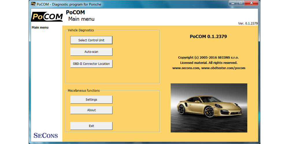 PoCOM е диагностика на автомобили Porsche. Комплектът се състои от интелигентен диагностичен адаптер с USB връзка и програма за Windows OS. Предимството е произходът на европейския производител Secons и неограничените актуализации, включени в цената. Техническата поддръжка от производителя е предимство - ако откриете неподдържан контролер или някоя функция не работи както се очаква, е възможно да се свържете с нас или директно с производителя.