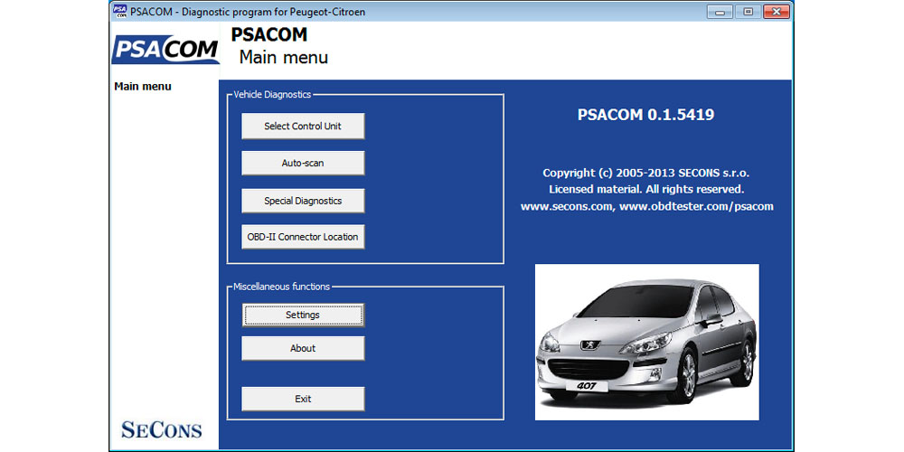 Програмата PSACOM поддържа автомобили на PSA (Peugeot и Citroen). Програмата е в състояние да показва идентификация, да чете и изтрива паметта за грешки. За всички важни управляващи блокове, тя показва измерените стойности подробно.