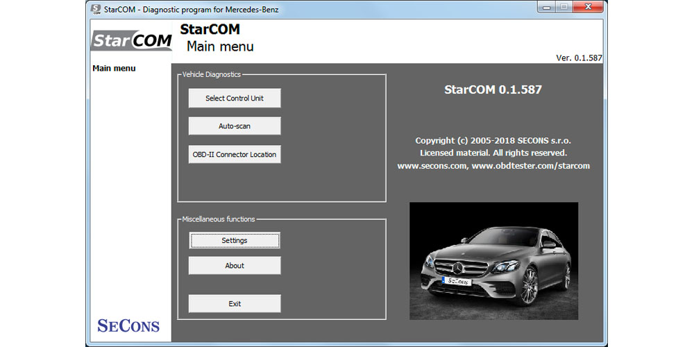 StarCOM е диагностиката за автомобили Mercedes и Smart. Комплектът се състои от интелигентен диагностичен адаптер с USB връзка и програма за Windows OS. Предимството е произходът на европейския производител Secons и неограничените актуализации, включени в цената. Техническата поддръжка от производителя е предимство - ако откриете неподдържан контролер или някоя функция не работи както се очаква, е възможно да се свържете с нас или директно с производителя.